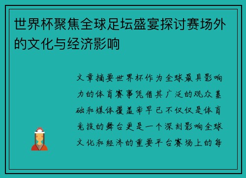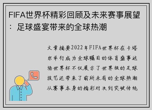 《回顾FIFA 06世界杯:经典赛事与球员传奇的巅峰对决》将深入探讨2006年德国世界杯中的经典赛事、传奇球员以及重要战役带来的影响。这一届世界杯不仅是对球员个人技艺和战术运用的巨大考验,也是世界足球历史上的一次巅峰对决。文章将从四个方面详细分析:赛事的历史背景与足球文化、世界杯经典赛事回顾、影响力...