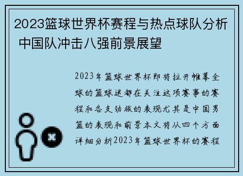 2023篮球世界杯赛程与热点球队分析 中国队冲击八强前景展望
